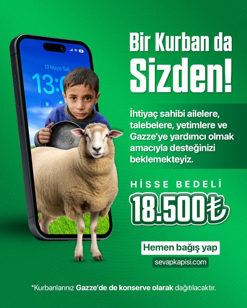 Siz de Gazze'deki kardeşlerimize umut olmak, bir ailenin sofrasına katkıda bulunmak ve bir yetimin yüzünde tebessüme vesile olmak için kurban bağışınızı gerçekleştirebilirsiniz.